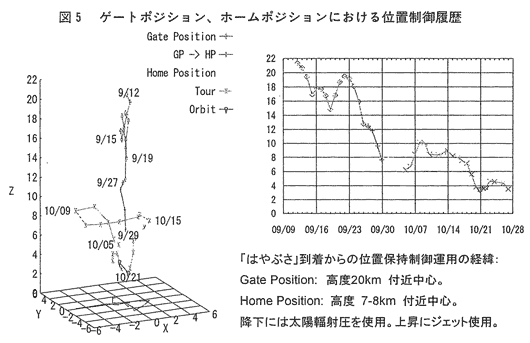 4.遠隔観測フェーズと科学観測成果 「はやぶさ」は、到着後からイトカワに対する相対位置制御を開始し、当初の20㎞近傍のゲートポジションから高度が7㎞ないしそれ以下のホームポジションへと高度を下げてイトカワの観測を行い、さらに10月下旬には高度を3~4㎞にまで降下させて詳細な地形や表面材料の分析観測を行った。図5には、この9月から10月にかけて行った遠隔観測フェーズにおける高度履歴を掲げた。 探査機には、この間主として太陽輻射圧が作用し、1日に1m/sec程度の加速度が加わり、この位置制御においても、降下時にはこの効果を最大限利用し、上昇時においてのみRCS(ジェット)による制御を加えて、高度維持が可能だった。