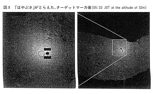 「はやぶさ」探査機は、底面から試料採取ホーンの先端までが1mしかなく、また、太陽電池板から同ホーン先端までが2mほどであるため、探査機の水平面内の投影形状内に、それらを超える高さの起伏が存在する可能性を極力小さくしなければならないという、着陸に関わる大きな制約が存在した。実際、Woomera域には、探査機の水平面内の投影形状内の起伏が1mを下回る可能性はほとんどありえず、着陸候補点としては、依然リスクを排除できないものの、MUSES-Sea域に限定されると判断せざるをえなかった。 11月9日の飛行時にターゲットマーカの分離を確認した写真を、図8に掲げた。表面に投下した際の転がりを防止するための突起までもがよく確認できる。フラッシュランプによりマーカだけを抽出する画像処理機能も、計画通りに確認することができた。